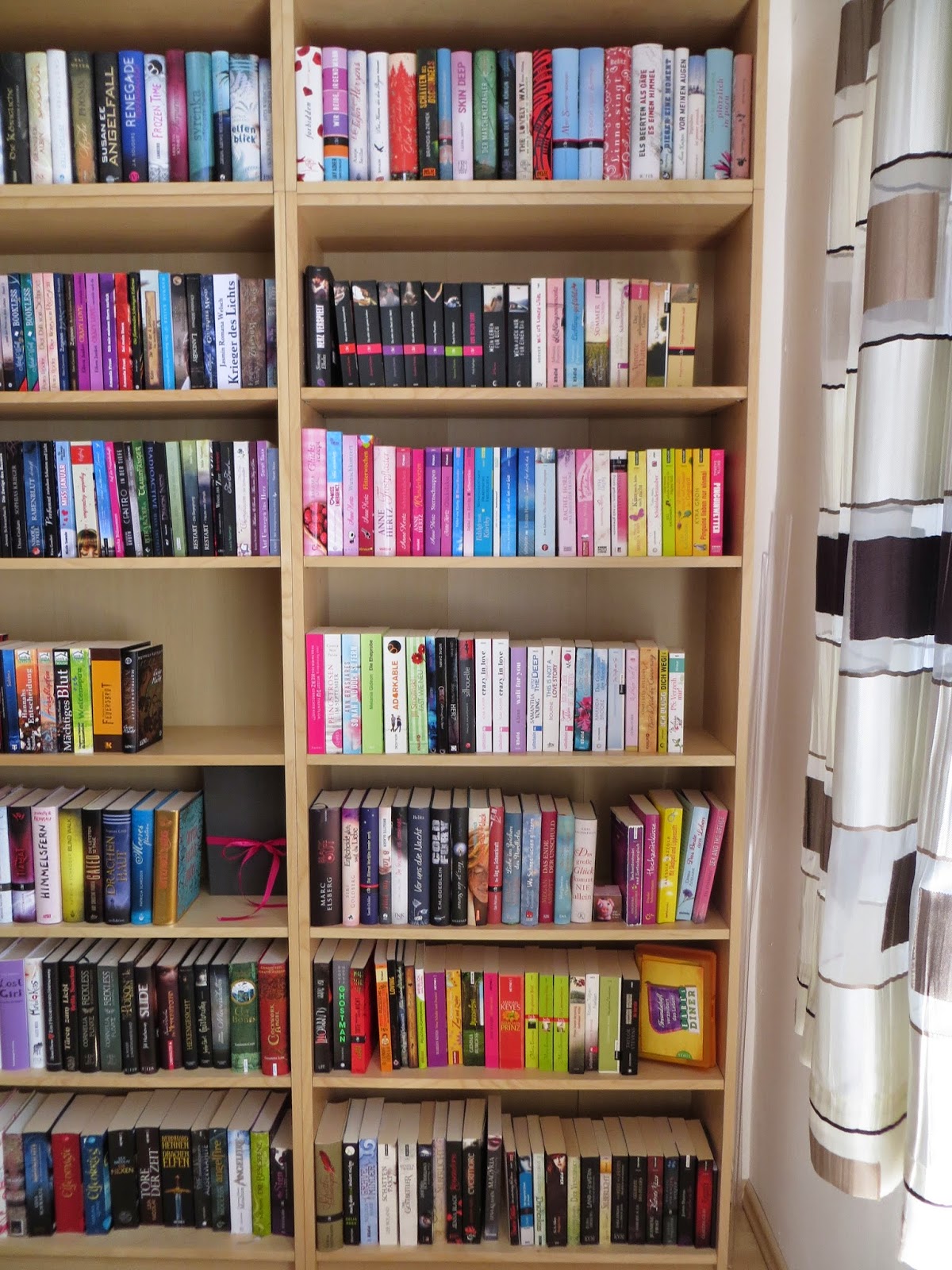 Du hast wunderschöne Regale 🙂 Es ist sogar noch ein bisschen Platz für neue Bücher und wirkt nicht vollgestopft. Zum neidisch werden 😉
