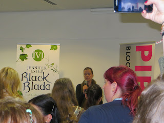 Barbara Romeiser vom Verlag begrüßte uns sehr herzlich und teilte uns mit, dass die Autorin Jennifer Estep sich unseren Fragen stellen und hinterher noch signieren würde. Auch darüber freute ich mich riesig, da ich die Mythos Academy Reihe geradezu verschlungen hatte und ihr neues Buch „Black Blade“ unbedingt signiert haben wollte.