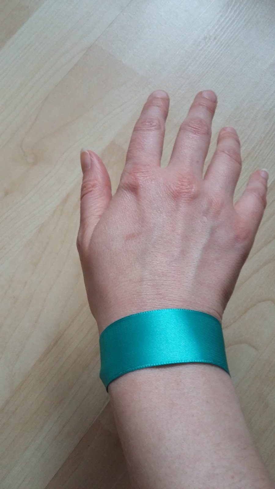 Außerdem könnt Ihr mich auch noch am türkisen Blogger-Bändchen erkennen